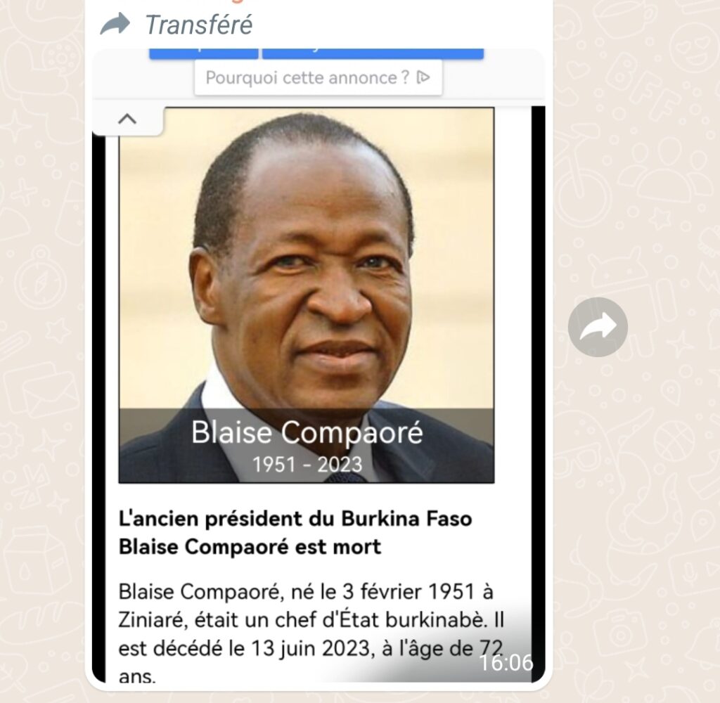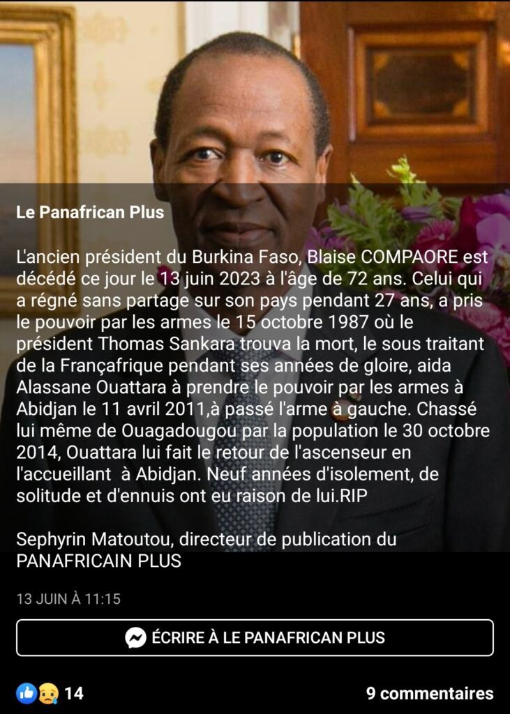 « #Burkina-Blaise Compaoré/Des informations sur la mort de l’ex-Président du Burkina Faso inondent la toile ce 13/6/ . Faux ! Il n’est pas mort. Il est vivant, vivant et vivant. Autre précision : ce 13/6/ il est dans sa résidence à Abidjan et non évacué dans un pays du golfe », a tweeté le journaliste Serge Daniel, qui couvre le Sahel depuis plusieurs décennies. Il avait annoncé en exclusivité la visite controversée de Blaise Compaoré au Burkina Faso en juillet 2022, période où Paul-Henri Sandaogo Damiba était aux commandes du pays .