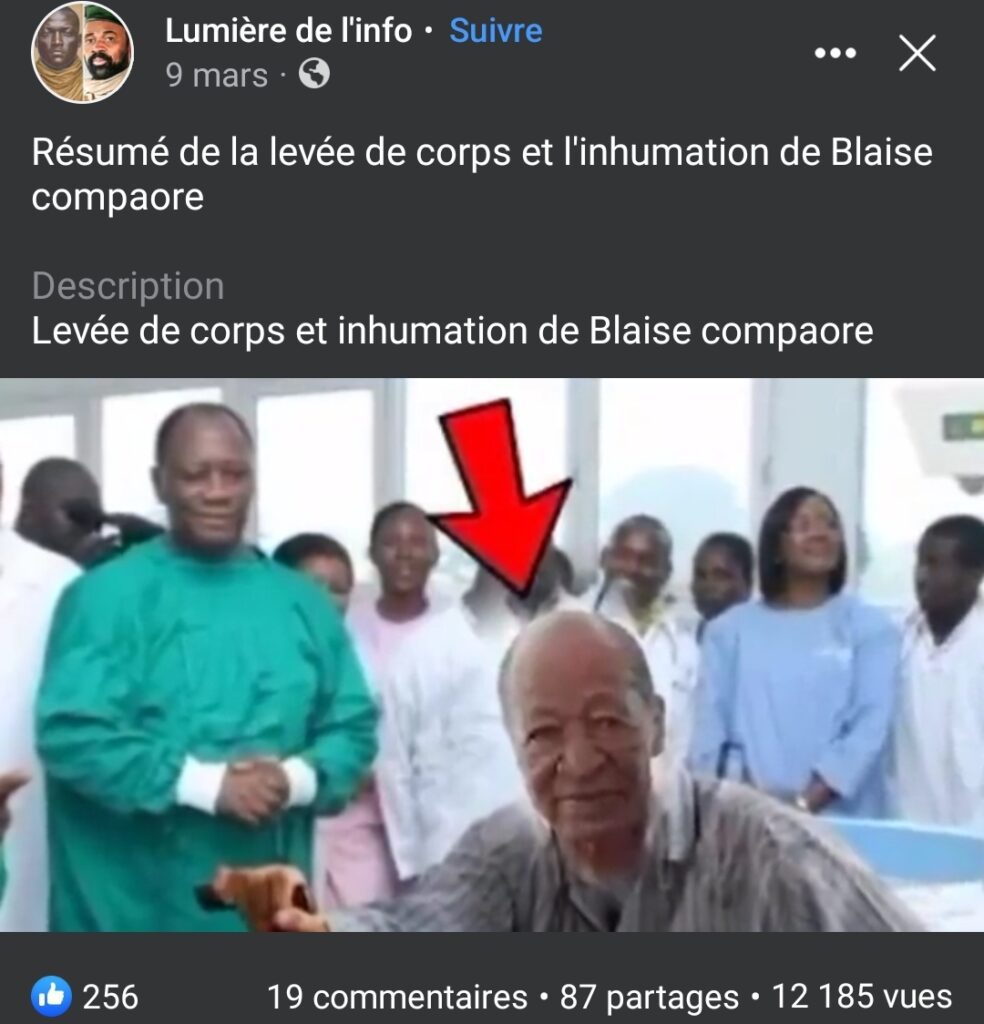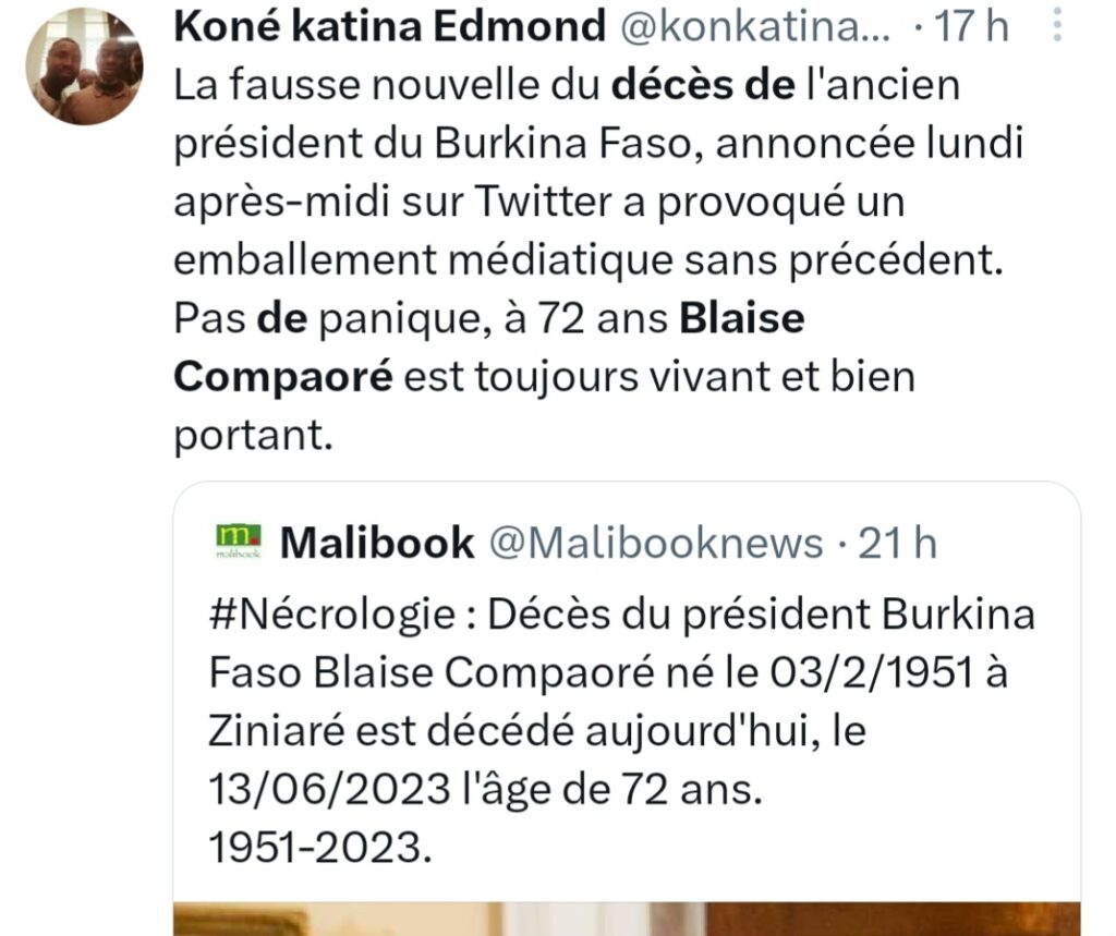 Ni le gouvernement du Burkina ni celui de la Côte d'Ivoire n’a annoncé la mort de Blaise Compaoré, encore moins des journaux jugés crédibles de la presse locale burkinabè ou internationale. Suite à la dernière folle rumeur en date, le journaliste Serge Daniel, comme d’autres journalistes sérieux, avait apporté un démenti dans un tweet daté du 13 juin, à 21:49 GMT.