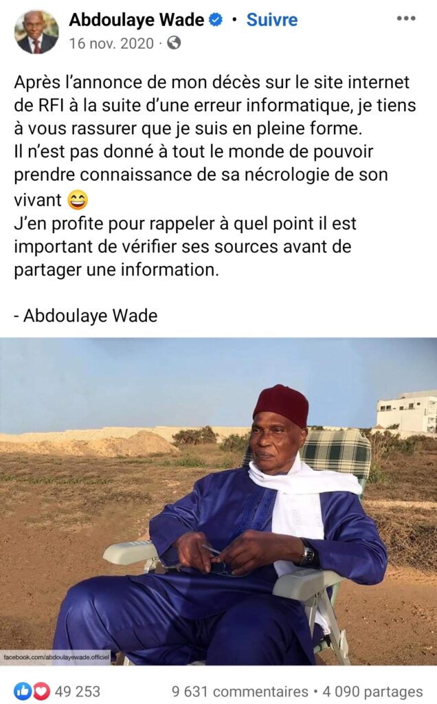 Comme mentionné par Necropedia, bien qu'il soit satirique , il s'avère que les agences de presse préparent les nécrologies des grandes personnalités pendant qu’elles vivent encore. Mais celles-ci ne sont jamais rendues publiques avant la confirmation de leur décès. Sauf par erreur, bien évidemment, comme ce fut le cas, par exemple, chez nos confrères de "RFI" le 16 novembre 2020. Suite à une erreur technique, les nécrologies d’une dizaine de personnalités ont été involontairement publiées sur le site internet de la radio avant d’être rapidement retirées, le retrait est suivi d'excuses pour publication involontaire de ces nécrologies, dont celles du président malien d’alors , et l’ancien président sénégalais Abdoulaye Wade . Ce dernier avait réagi via une publication postée sur sa page Facebook.