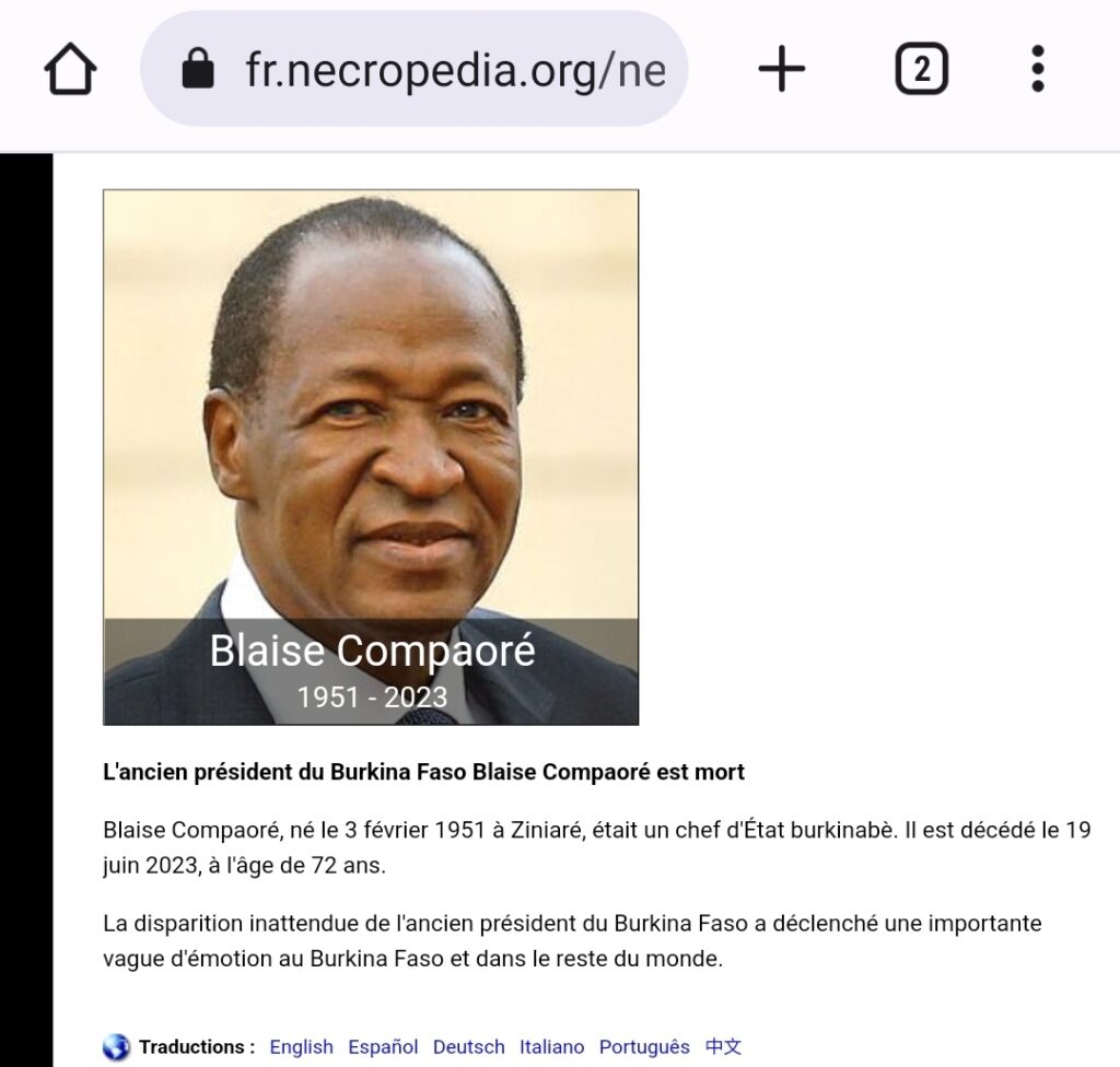 « L'ancien président du Burkina Faso Blaise Compaoré est mort ». C’est le titre d’un court texte du site Necropedia, spécialisé dans les nécrologies anticipées, largement relayé sur les réseaux sociaux . « Blaise Compaoré, né le 3 février 1951 à Ziniaré, était un chef d’État burkinabè. lI est décédé le 13 juin 2023, à l’âge de 72 ans », peut-on lire dans le texte du site satirique, sans donner le contexte du prétendu décès. Néanmoins, sur le même site, il est signalé d’entrée qu’il s’agit de sa « nécrologie anticipée » et que « "anticipée" signife qu’il n’est pas mort ».