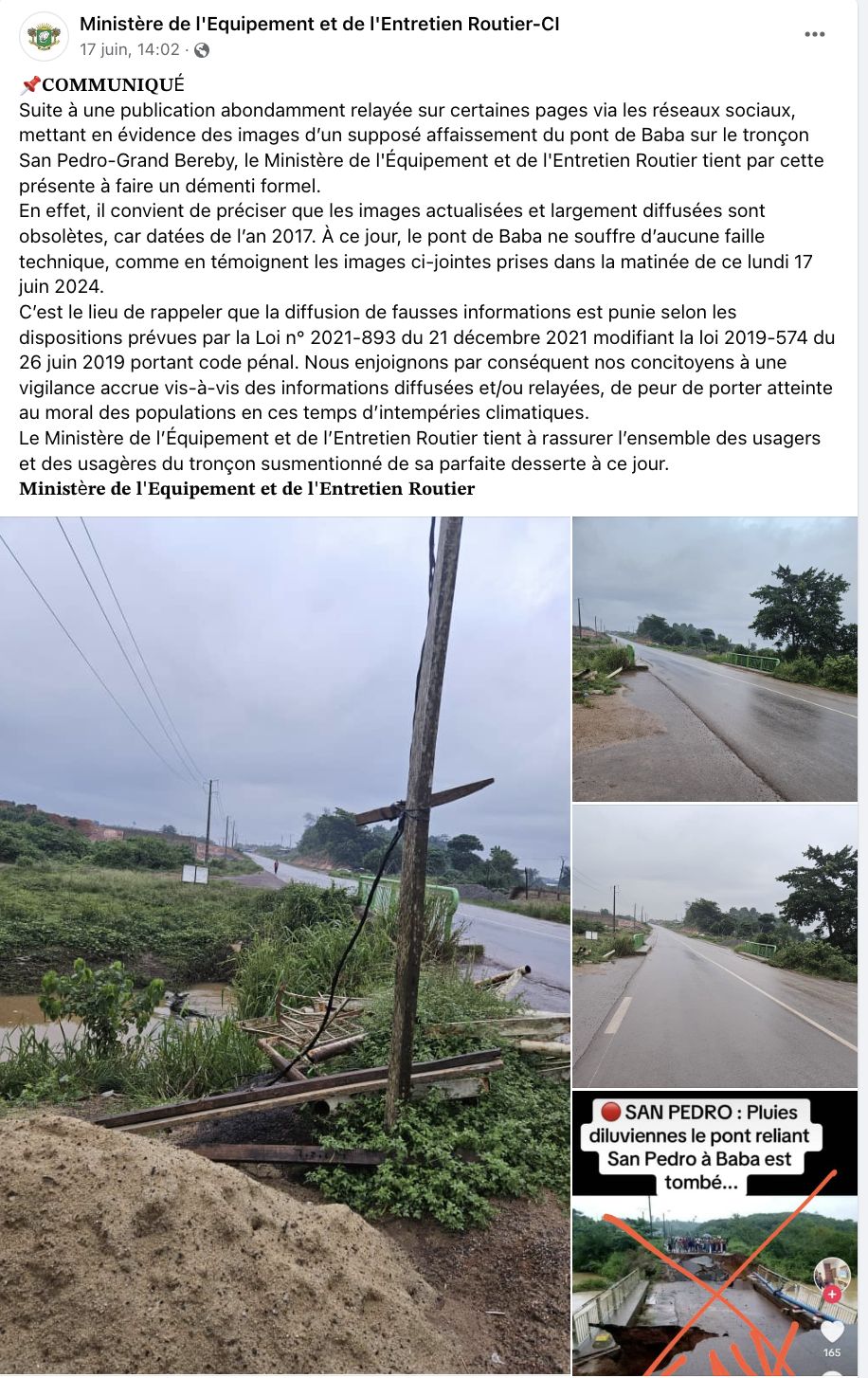 mortes, a annoncé l’Office national ivoirien de la protection civile (ONPC), dans unne publication sur leur page Facebook, le 23 juin 2024. Deux personnes sont portées disparues, emportées par les eaux, précise l’ONPC. C’est dans ce contexte que des images circulent sur les réseaux sociaux et certaines sont présentées comme des preuves des dégâts causés par les inondations récentes. C’est le cas de cette photographie ci-dessous d’un pont en ruine, partagée le 16 juin 2024 par la page Facebook Mali info, avant d’être supprimée. Le post avait déjà été partagée plus 69 fois et a généré plus de 600 mentions « j’aime ». La légende de la publication indique : « SAN PEDRO : Pluies diluviennes Le pont reliant San Pedro à Baba est tombé 🇨🇮 Le Mali est le berceau de l’humanité 🇲🇱 ». La photo a été plusieurs fois partagé sur le même réseau social par d’autres internautes (1, 2, 3, 4, 5). Une image des inondations en Côte d’Ivoire de juin de 2017 Une recherche d’image inversée effectuée avec l’outil de vérification InVID-WeVerify a révélé que cette image a été prise lors des inondations de juin 2017 en Côte d’Ivoire. La photographie, diffusée par plusieurs sites internet, montre le pont reliant San-Pedro à Grand-Béréby (situé dans le sud-ouest de la Côte d’Ivoire) qui avait cédé le 13 juin à la suite de fortes pluies. Cette information a été rapportée par plusieurs médias (1, 2, 3). Démenti du gouvernement ivoirien Sur sa page Facebook, le ministère de l’Équipement et de l’Entretien Routier ivoirien a publié un communiqué pour démentir cette information. Il confirme que l’image que nous vérifions, largement partagée sur internet, est ancienne et date de juin 2017. « Suite à une publication abondamment relayée sur certaines pages via les réseaux sociaux, mettant en évidence des images d’un supposé affaissement du pont de Baba sur le tronçon San Pedro-Grand Bereby, le ministère de l’Équipement et de l’Entretien Routier tient par la présente à faire un démenti formel. En effet, il convient de préciser que les images actualisées et largement diffusées sont obsolètes, car datées de 2017. À ce jour, le pont de Baba ne souffre d’aucune faille technique, comme en témoignent les images ci-jointes prises dans la matinée de ce lundi 17 juin 2024. » De plus, il a partagé des photos de l’état actuel du pont de Baba sur le tronçon San Pedro-Grand Bereby, prises le 17 juin 2024. Ces images montrent que le pont est en bon état. / Conclusion L’image partagée sur les réseaux sociaux n’illustre pas les récentes inondations en Côte d’Ivoire, mais date de juin 2017. Les autorités ivoiriennes ont confirmé que cette photo est ancienne et que le pont de Baba est actuellement en bon état. Cet article fait partie d’une série d’articles consacrés à la lutte contre la désinformation en Afrique francophone. La production est réalisée avec le soutien de l’Organisation internationale de la Francophonie (OIF) dans le cadre du projet « Jumelage entre initiatives francophones de lutte contre la désinformation ».Tama Média, La Voix de Mopti et Sétanal Média ont formé un consortium pour postuler à cet appel à projets et ont ainsi obtenu le soutien de l’OIF pour la réalisation du projet suivant : « Mali, Sénégal : l’intelligence artificielle et les contenus audiovisuels en langues locales au service de la lutte contre la désinformation auprès des personnes analphabètes et auprès de la diaspora sénégalaise et malienne en Europe ».