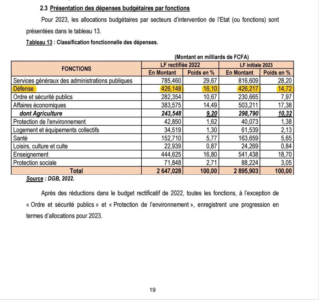 Avec deux captures d'écran à l'appui, issues du document de la Loi de finances 2023 (p. 19, tableau 13, et p. 20, 2.4.3 Renforcement de la défense et de la sécurité), il ajoute : « J'ai pris en compte la valeur minimale présentée par les autorités ici (qui est de) 426 milliards FCFA. Or, une page plus loin, les chiffres se contredisent en avançant un montant plus élevé, près de 441 milliards. »
