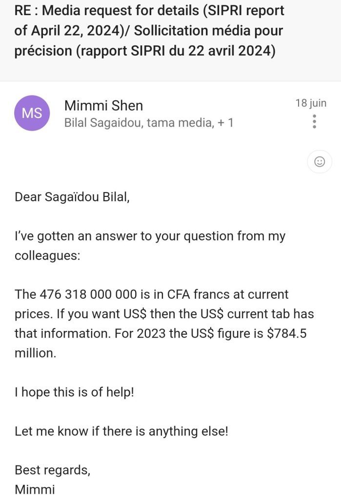 Pour lever toute équivoque, nous avons adressé un courrier électronique au Sipri pour nous apporter des éclaircissements sur la devise de ses estimations quant à la période de 2023 pour le Mali.