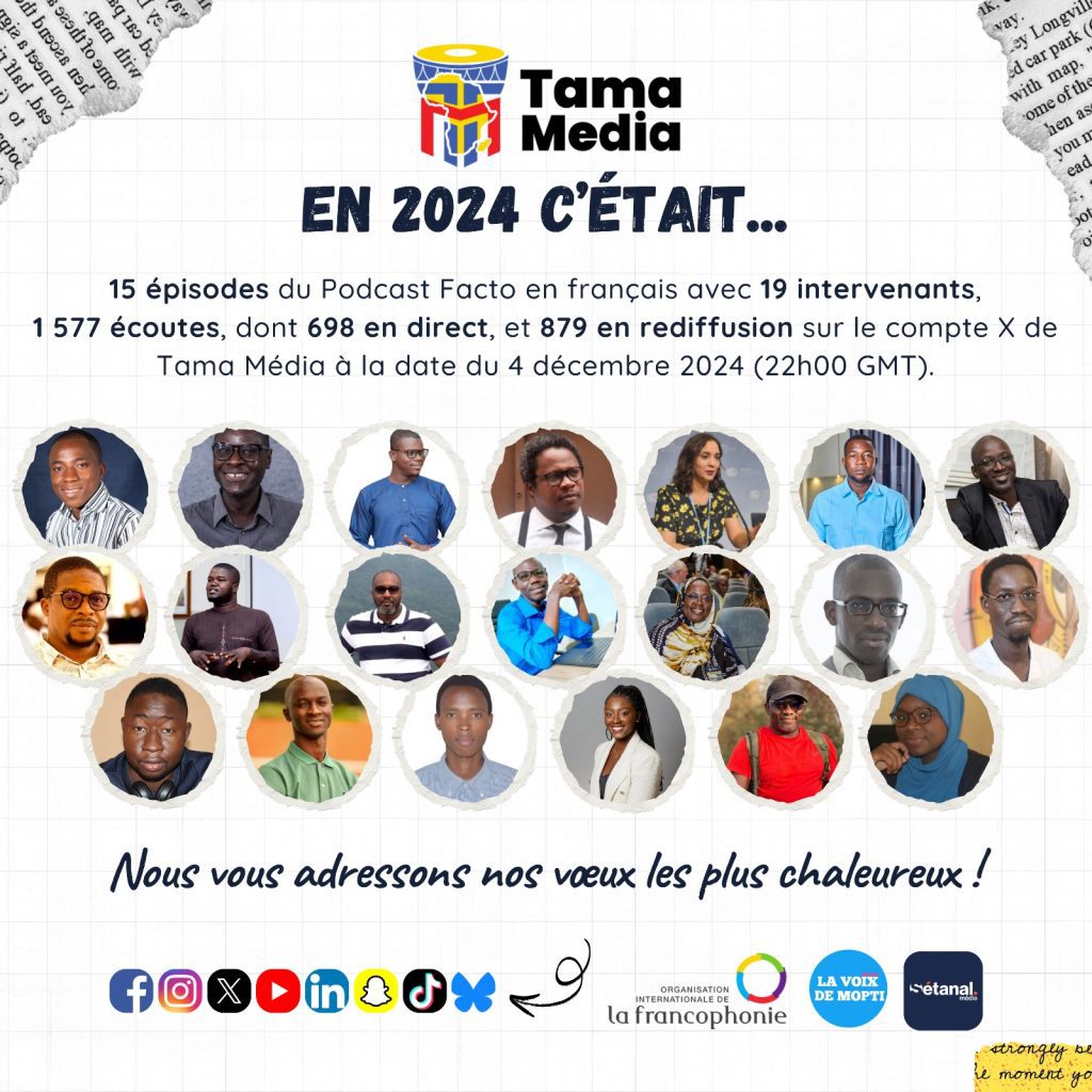 En 2024, après une série de Spaces consacrée à la Can Côte d’Ivoire 2023 et parallèlement aux articles produits et publiés sur le site, Tama Média a enregistré sur son compte X (ex-Twitter) différents épisodes du Podcast Facto sur la désinformation et le fact-checking en Afrique de l'Ouest dans le cadre de notre projet de jumelage, intitulé “l’Intelligence Artificielle au service de la lutte contre la désinformation en Afrique de l’Ouest francophone”, en partenariat avec La Voix de Mopti et Sétanal Média, avec le soutien financier de l'OIF.