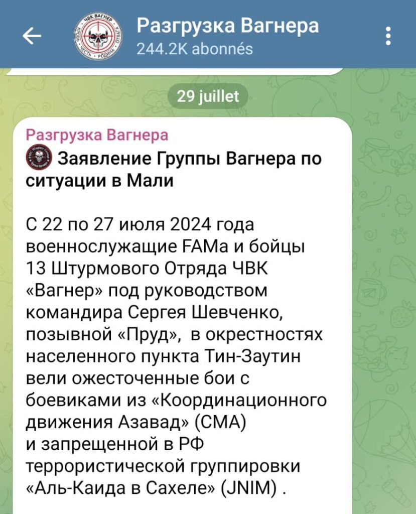Le samedi 27 juillet, plusieurs sources ont signalé une embuscade meurtrière visant les Fama et les « instructeurs russes » du 13e détachement d’assaut de Wagner aux abords de Tinzaouatène, bien que cette information n’ait pas été officiellement confirmée jusque-là. Dans les réseaux pro-russes, la consternation est palpable, avec des messages commémoratifs en hommage aux membres de leur groupe tombés en terre malienne.