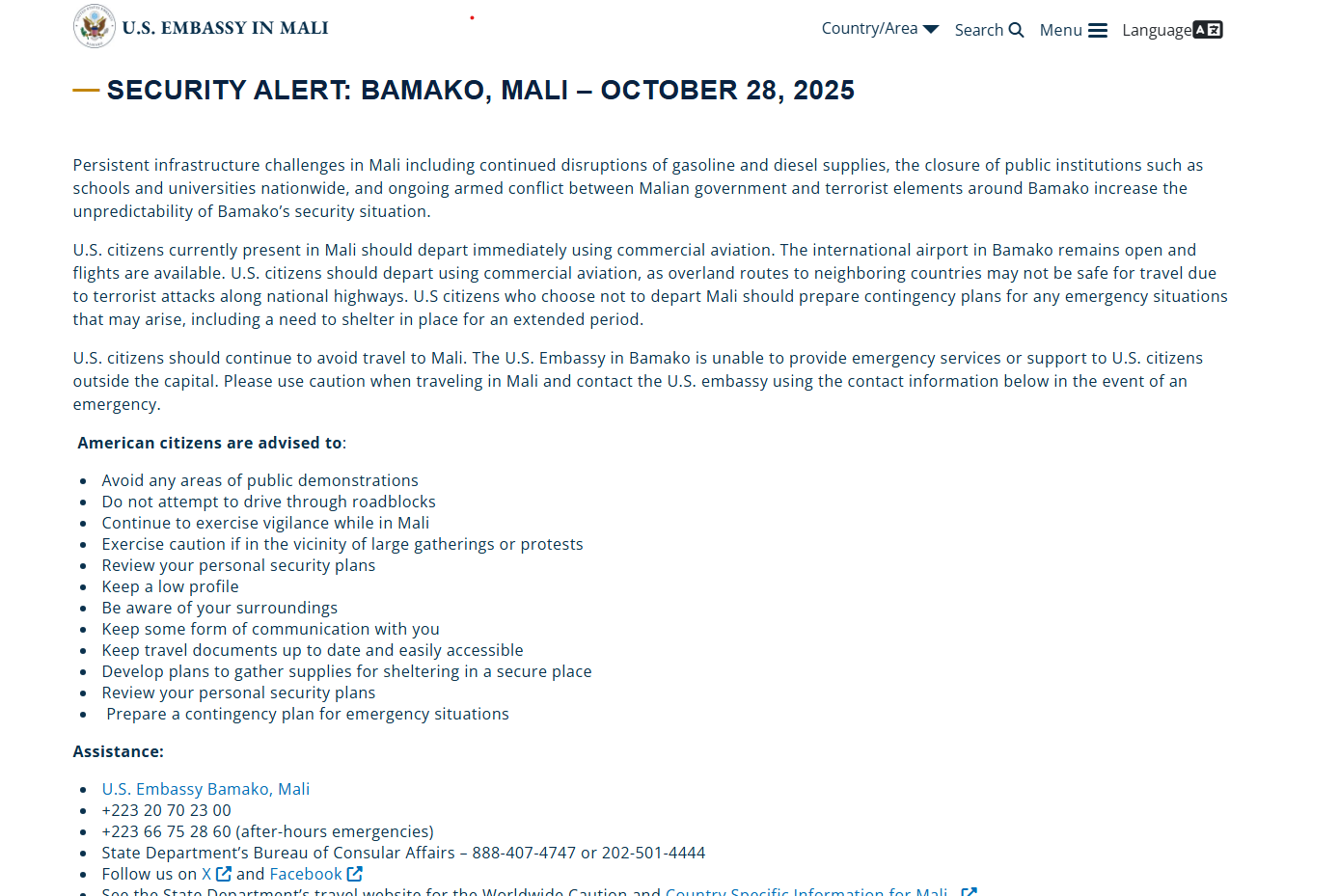 Bamako, 31 octobre 2025. Depuis septembre, les attaques du Groupe de soutien à l’Islam et aux musulmans (JNIM) continuent de perturber l'approvisionnement en carburant de plusieurs localités maliennes dont la capitale Bamako. Après une récente alerte de l'ambassade des USA au Mali, appelant ses citoyens à quitter le pays, un compte X identifié troll a faussement annoncé que la Russie a également lancé la même demande à ses ressortissants. Nous faisons le point sur les chancelleries qui ont appelé leurs ressortissants à quitter le Mali.