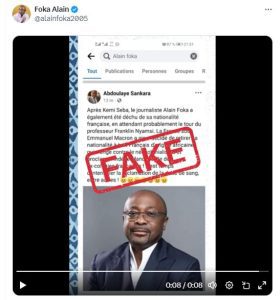 Sur son compte X, anciennement Twitter, Foka a publié un montage vidéo regroupant certaines des publications annonçant la perte de sa nationalité française, les accompagnant de l’estampille « Fake » qui veut dire faux en français.